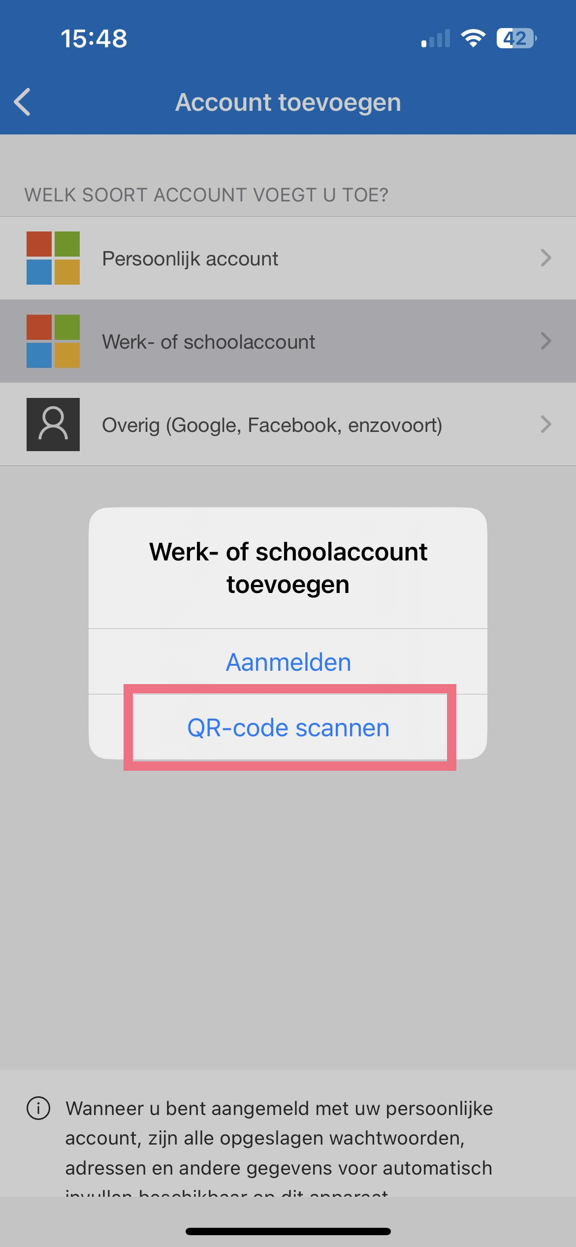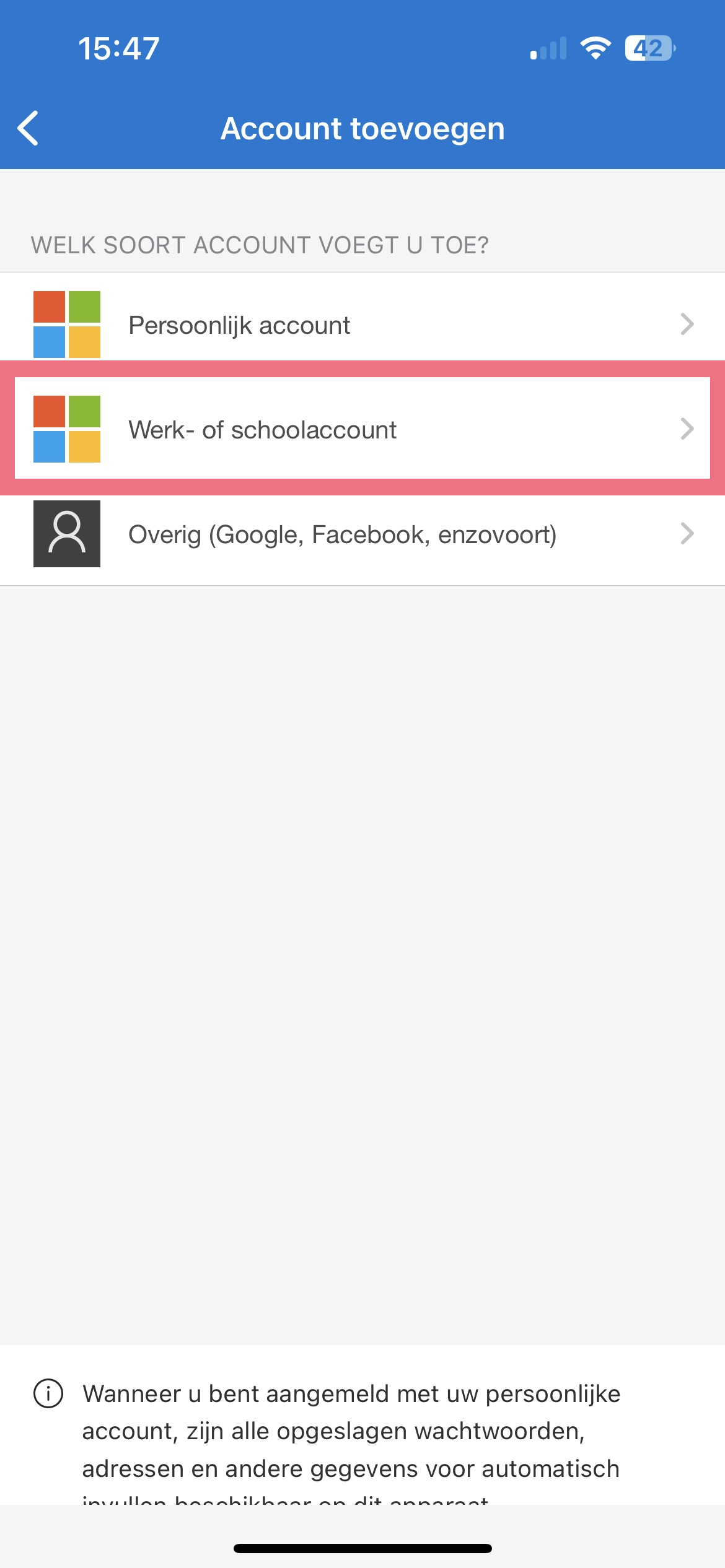 Let op: Gebruikt u de Microsoft authenticator? Selecteer Werk- of schoolaccount.