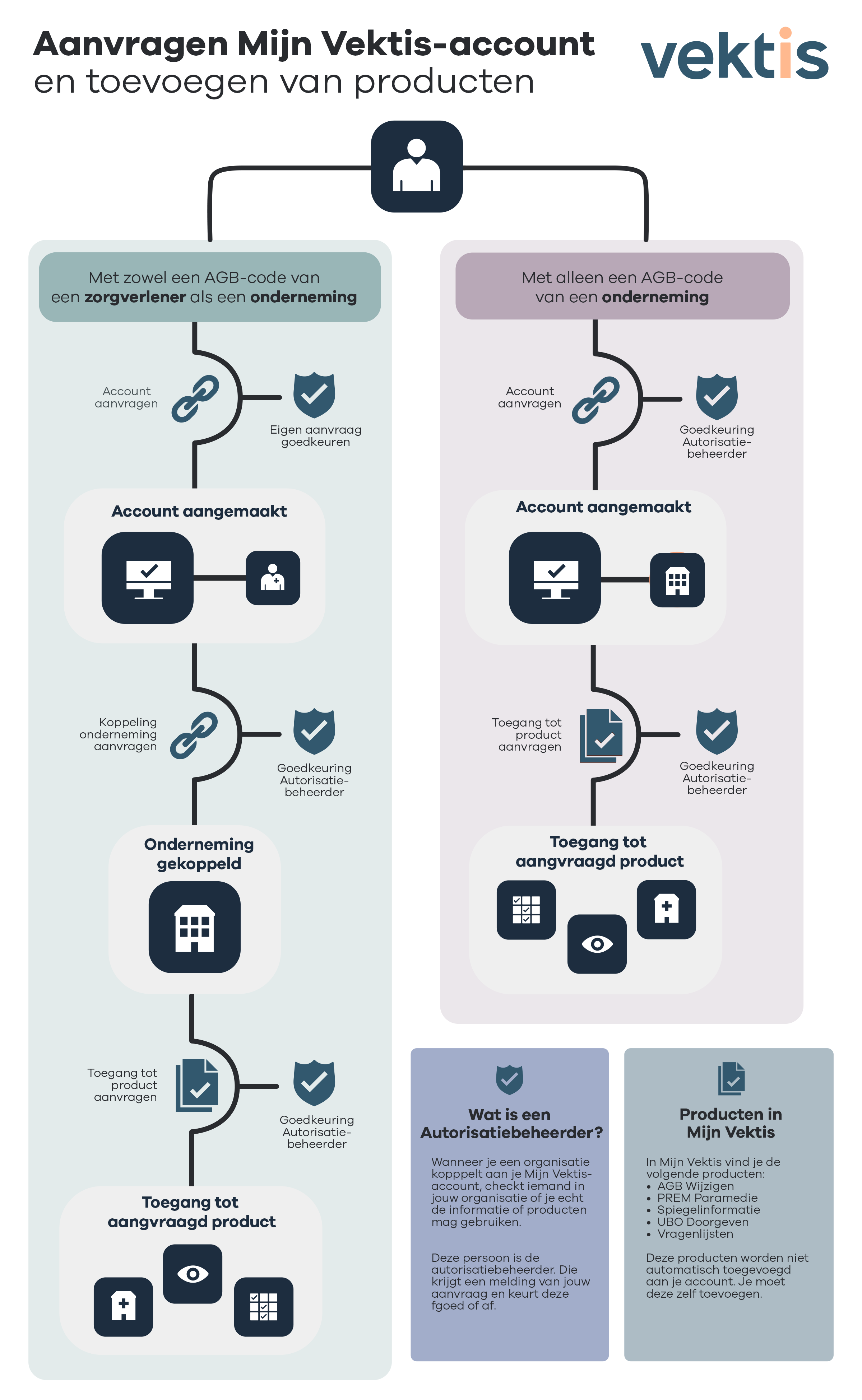 In de meeste gevallen wil je producten of informatie gebruiken van de onderneming of organisatie waarvoor je werkt. Koppel daarom jouw Mijn Vektis-account aan het account van de onderneming. Dat doe je op je eigen Mijn Vektis pagina.